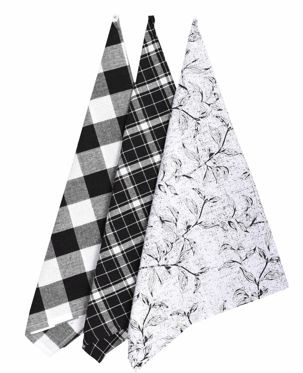Tento komplet tří utěrek je vyroben ze 100% přírodní bavlny vysoké kvality, která zaručuje skvělou savost a dlouhou životnost. V sadě naleznete dva kusy žakárových utěrek s oboustranným vzorem a jednu hladkou utěrku s jednostranným potiskem v odstínech černé a bílé, což umožňuje jejich elegantní sladění s jakýmkoliv kuchyňským stylem.