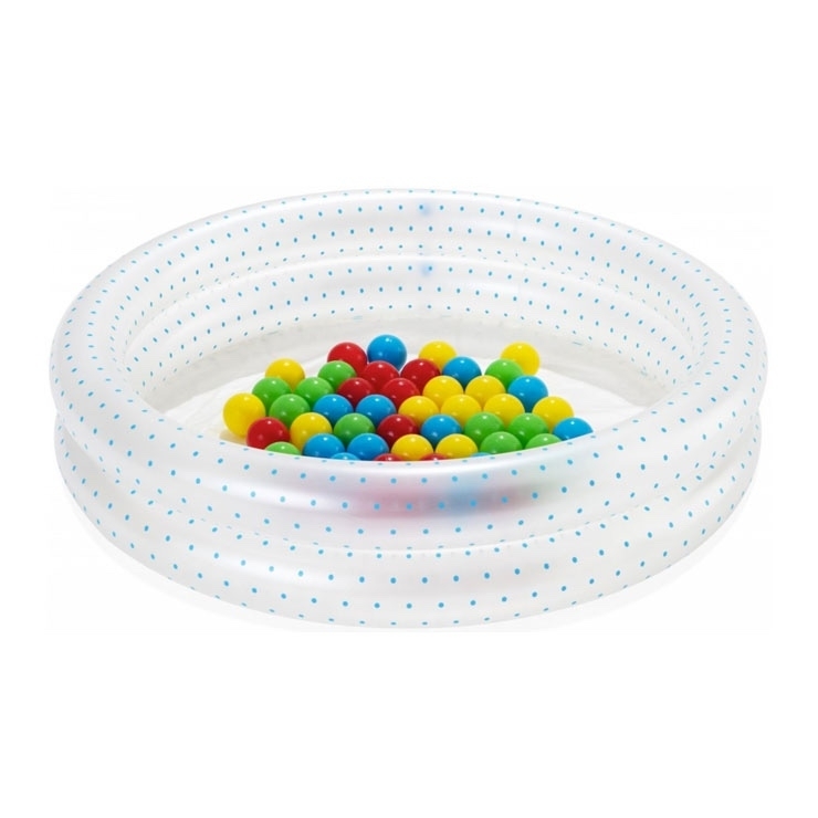 Dva nafukovací kruhy zajišťují dětem měkkou podporu. Hru s 50 vícebarevnými hracími míčky si děti zamilují. Když je hezké počasí, naplňte bazének vodou a užijte si vodní hrátky. Bazének se snadno nafoukne, vyfoukne a složí. 2 barevné provedení (světle růžové a světle modré puntíky). Používejte pouze pod dohledem dospělé osoby.