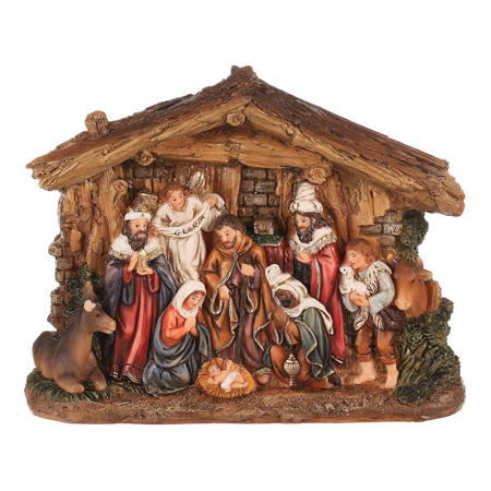 Tento betlém je vyroben z odolného polyresinu a zdobí jej syté barvy, díky kterým vyniknou všechny postavičky. Výjev zahrnuje všechny klíčové symboly - světlonoše betlémskou hvězdu, anděla, Pannu Marii, domácí zvířata a samozřejmě tři krále s dary. Díky pečlivému provedení působí realisticky a elegantně, ať už jej umístíte na stůl, parapet nebo jiný viditelný prostor ve vašem interiéru.