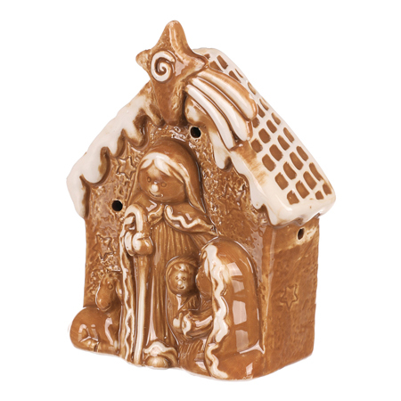 Ozdobte váš vánoční prostor s tímto kouzelným perníkovým betlémem z keramiky. Je v typické hnědé barvě s bílým zdobením. Tento betlém má otvory pro pronikání paprsků světla, a vnitřní LED osvětlení tak dodá do místnosti hřejivý a pohádkový nádech. Každá jeho část včetně postav vypadá, jako by byla skutečně upečena z perníku, což přidává na autentičnosti a elegantním vzhledu. Tato vánoční dekorace z keramiky vytváří nádherný a atmosférický zážitek, perfektní pro váš domov během svátečních dní.
