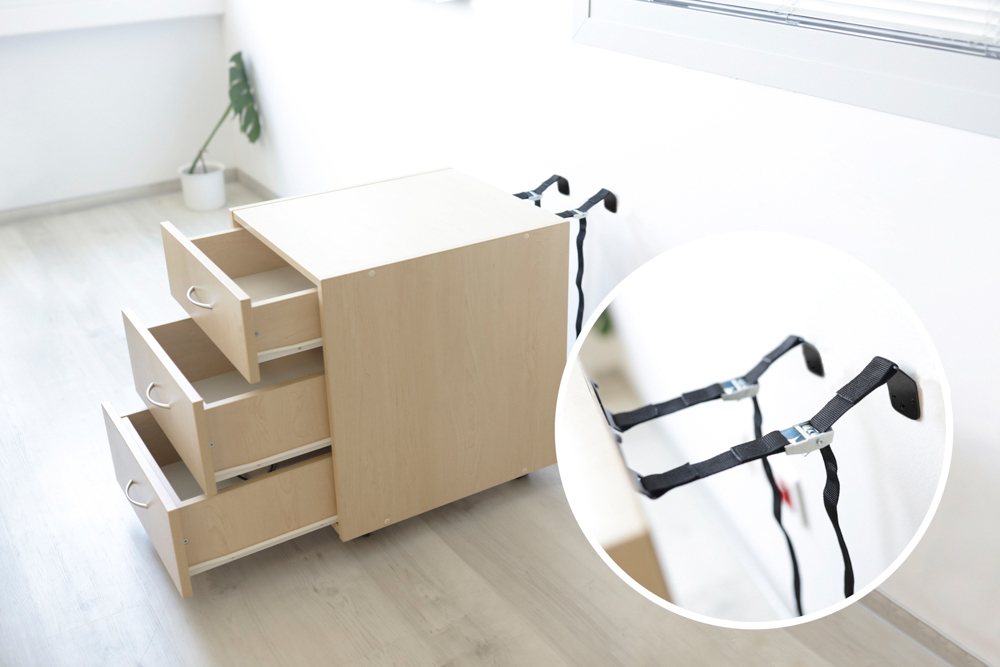 Pevné pásy zabraňují převržení nábytku v případě, že na něj dítě vleze. Lze