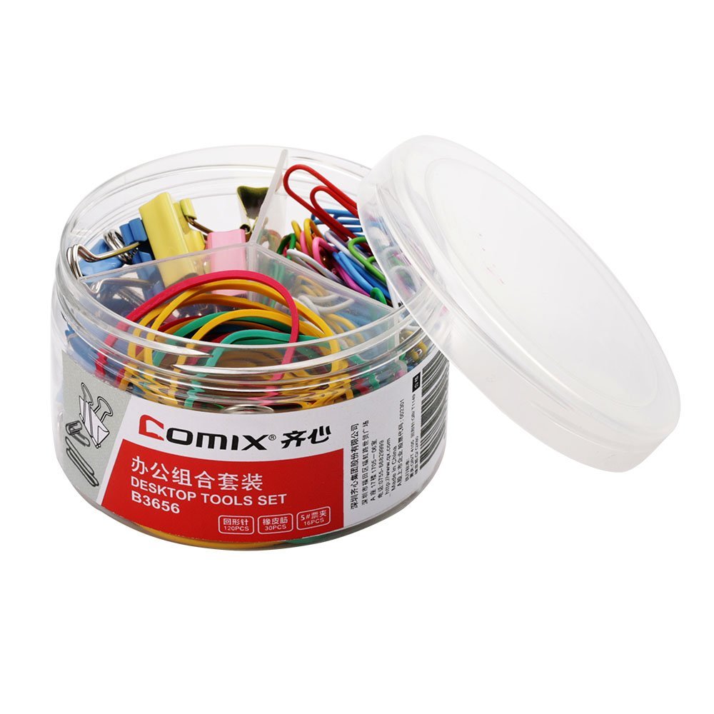 Kancelářská sada clipů, sponek a gumiček v barevném provedení. Nepostradatelné potřeby pro každou kancelář i domácnost. Baleno v plastové uzavíratelné krabičce.