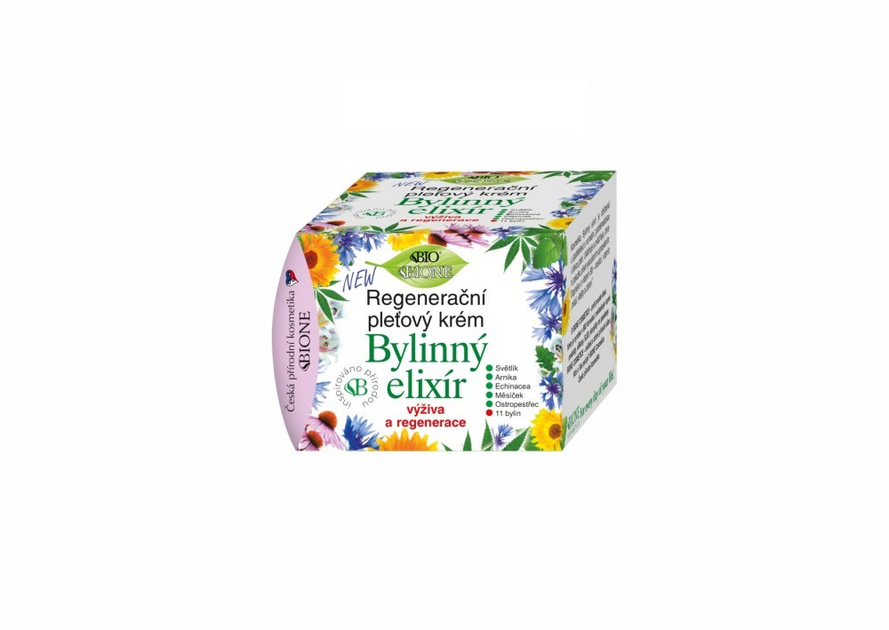Bylinkový pleťový krém s oblíbenými extrakty ze středoevropských bylin, s častým výskytem v kosmetice, nyní všechny spolu pro maximalizaci jejich blahodárných účinků. Spolu s dalšími složkami - hydratační glycerin, rostlinné bambucké máslo, panthenol, allantoin, vitamín E a další vitamíny a fosfolipidy z klíčového oleje, se podílejí na zvláčnění, zvlhčení a ochraně jemné pokožky obličeje. Chrání před vysoušením a praskáním. Moderně obsahuje sacharid inulin pro rychlou obnovu vlastní přirozené kožní mikroflóry. Vyrobeno v BIO recepturách. Krém je velmi lehký a rychle vstřebatelný. Krém obsahuje extrakt, olej nebo silici z těchto bylin: cannabis, měsíček, růže, světlík, echinacea, arnika, pampeliška, heřmánek, třezalka a ostropestřec.Kosmetika Bylinný elixír je oblíbená u spotřebitelů s normální, problematickou i citlivou pletí. Uklidňuje a zvláčňuje, chrání pokožku před vysoušením a praskáním. Doplněno o vitamín B8 - inositol, vitamín „mládí, vitalita a zdraví“.