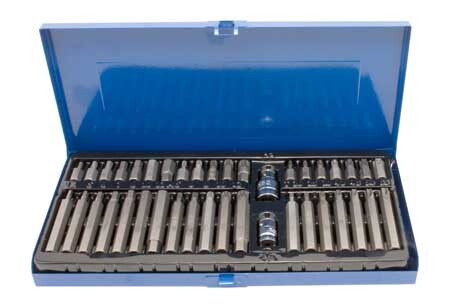 Sada 40 ks bitů 1/2 x 10, 3/8 x 10 mm TORX 7 x 30 mm: T20, T25, T30, T40, T45, T50, T557 x 75 mm: T20, T25, T30, T40, T45, T50, T55 Šestihran 7 x 30 mm: H4, H5, H6, H7, H8, H10, H12 7 x 75 mm: H4, H5, H6, H7, H8, H10, H12 Tisícihran 5 x 30 mm: M5, M6, M8, M10, M12 5 x 75 mm: M5, M6, M8, M10, M12