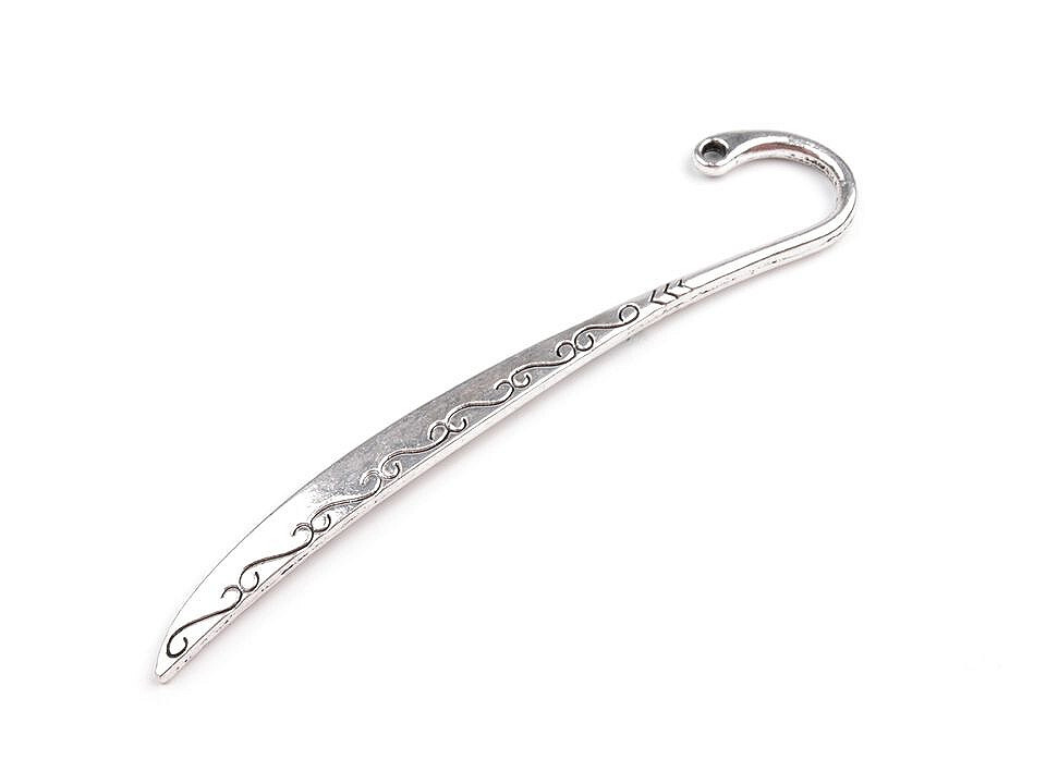 Rozměry: 5 x 85 mm (šířka x délka), průvlek očka 2 mm.Kovový polotovar určený k výrobě záložky do knihy. Je zcela na vás, jak si záložku dotvoříte. Na závěsné očko můžete připevnit řetízek s naketlovanými korálky, přívěsky s fimo hmoty, kovu či dřeva, nebo přivažte kousek stužky nebo bavlnky. Záleží zcela na vaší fantazii a vkusu. Záložka je zdobená ornamenty ve tvaru spirálek, má lehce prohnutý tvar a kulatý háček, který můžete zavěsit za okraj knihy. Zdobení je oboustranné.