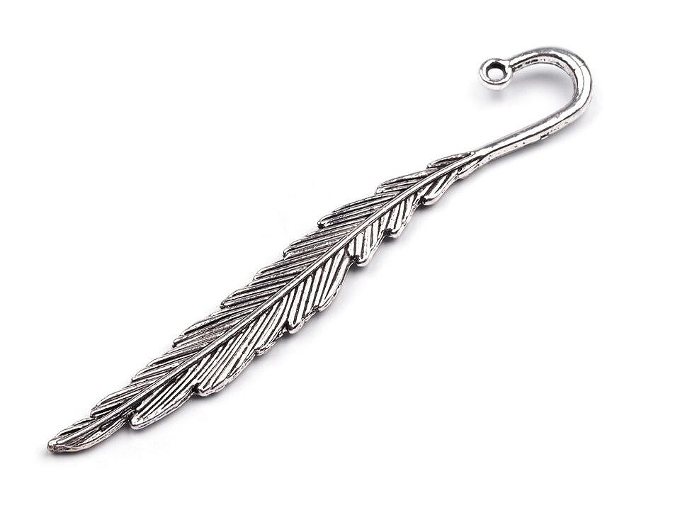 Kovový polotovar určený k výrobě záložky do knihy. Je zcela na vás, jak si záložku dotvoříte. Pokud si přejete menší záložku, stačí k očku připevnit např. stužku, korálky, přívěsek. Pokud chcete větší záložku, vystřihněte pruh z pevné látky nebo tvrdého papíru, na který upevníte toto pírko pomocí provázku, bavlny, mašličky atd. Ideální k rozproudění vaší fantazie. Pírko je zdobené a má kulatý háček, který můžete zavěsit za okraj knihy. Zdobení je oboustranné. Rozměry: 1 x 8 cm (šířka v nejširším místě x délka), průvlek 2 mm.