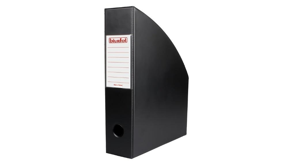 Wykonany z kolorowej folii PVC, wewnątrz usztywniony tekturą. Format A4 o ściętych bokach. Wyposażony w kieszonkę z wymienną etykietą opisową na grzbiecie. Okrągłe wycięcie na palec pozwalające na łatwe wysuwanie pojemnika. Szerokość grzbietu 7 cm.
