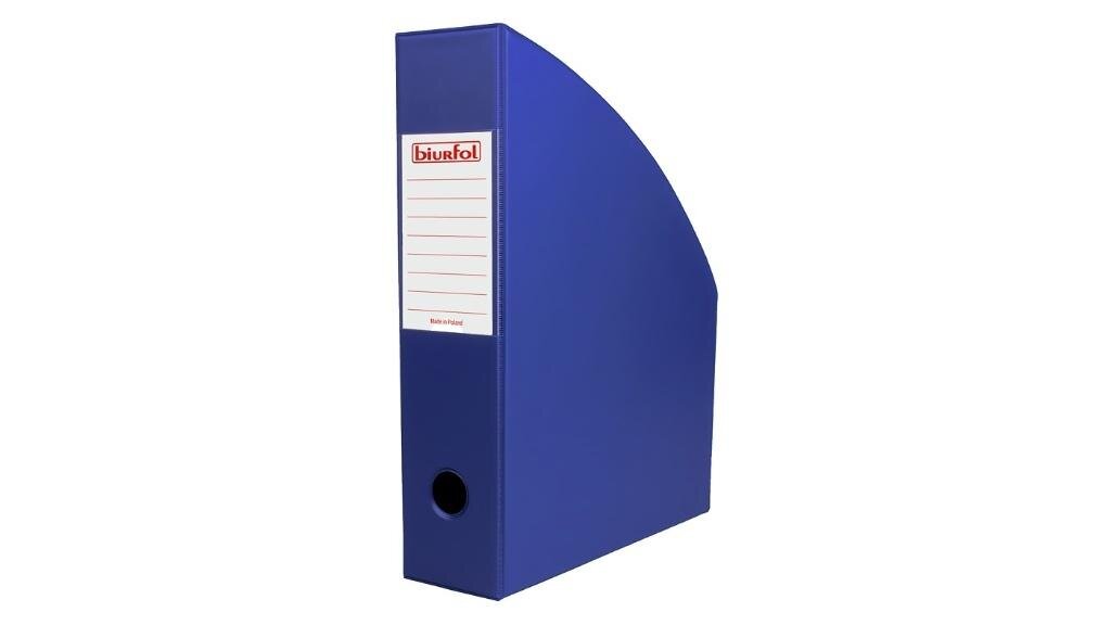 Wykonany z kolorowej folii PVC, wewnątrz usztywniony tekturą. Format A4 o ściętych bokach. Wyposażony w kieszonkę z wymienną etykietą opisową na grzbiecie. Okrągłe wycięcie na palec pozwalające na łatwe wysuwanie pojemnika. Szerokość grzbietu 7 cm.