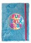 Notatnik ma króciutkie, błękitne futerko. Na środku okładki znajduje się mieniący metalicznie okrąg z napisem FUR EVER BUSY. Wygodna gumka zabezpiecza notatnik przed przypadkowym otwarciem.