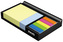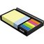 Przybornik z karteczkami na biurko. Zawiera: notes żółty pastelowy o wymiarach 76x76mm - 200 karteczek, notes/zakładki niebieskie pastelowe o wymiarach 76x25mm - 200 karteczek oraz komplet klasycznych zakładek indeksujących o wymiarach 45x12mm, mix 5 kolorów neonowych, po 25 zakładek w każdym kolorze, w sumie 125 zakładek. Dodatkowo przybornik posiada specjalne miejsce na umieszczenie długopisu. Bardzo przydatna pomoc na każdym biurku - w domu i w biurze.