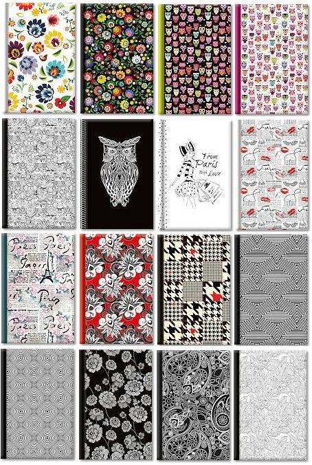 Notesy książkowe z blokiem notatnikowym na papierze ecru, w delikatne szare linie oraz czerwoną wstążką. Dostępne w trzech różnych formatach. Kolorowe okładki graficzne, powleczone specjalną aksamitną folią. Możliwość wklejek reklamowych.