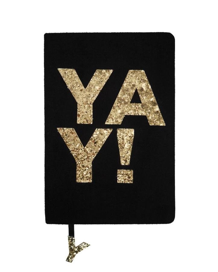 Format A5.96 kartek.Oprawa tekstylna.Brokatowa oprawa.Linia.Kolor czarny ze złotym napisem YAY. číst celé