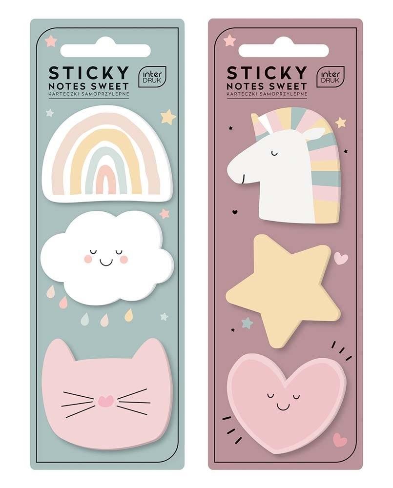 Karteczki samoprzylepne do codziennej organizacji, zaznaczania stron w książkach, robienia krótkich notatek oraz zostawiania ważnych wiadomości. Nie pozostawiają śladu po odklejeniu. Można po nich pisać. 2 wzory do wyboru. 75 szt. karteczek.