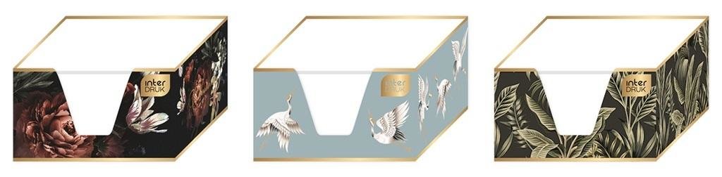 Kostka papierowa biała o wymiarach 9 x 9 x 5 cm w kubiku, linia: Satin Gold.