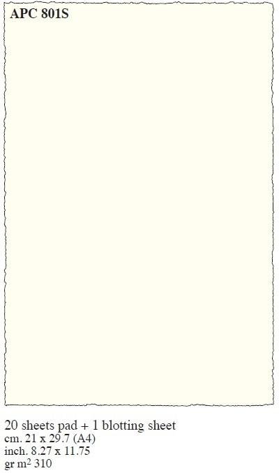 Papier czerpany w kolorze kremowym, format A4 z podkładką 20 arkuszy. Gramatura papieru 310g/m2. Wyprodukowano we Włoszech.