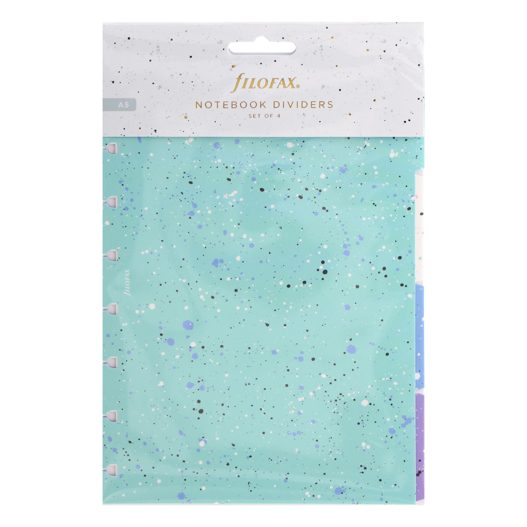 Plánujte a tvořte! Dodejte Vašemu Filofax Notebook více pestrosti s touto barevnou sadou čtyř odolných plastových rozřazovačů z naší kolekce Expressions, které jsou speciálně navržené aby ladily s Vašim plnitelným zápisníkem Filofax Notebook A5. Tato sada obsahuje oboustranně potištěné rozřazovače v barvách Mint, světle modrá, bílá a fialová. Další vlastnosti 4 rozřazovače s prázdnou záložkou