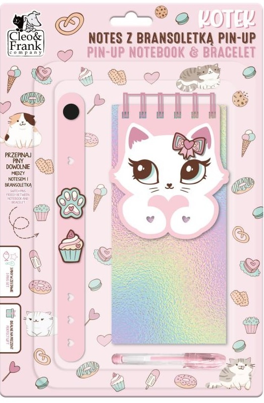 W zestawie znajduje się gumowa bransoletka, notatnik, długopis oraz trzy ozdobne piny. Zarówno okładka notesu, jak i bransoletka posiadają specjalne miejsca umożliwiające wpięcie pinów. Możesz dowolnie wymieniać piny między notesem a bransoletką, tworząc własne aranżacje. Zestaw ten stanowi...
