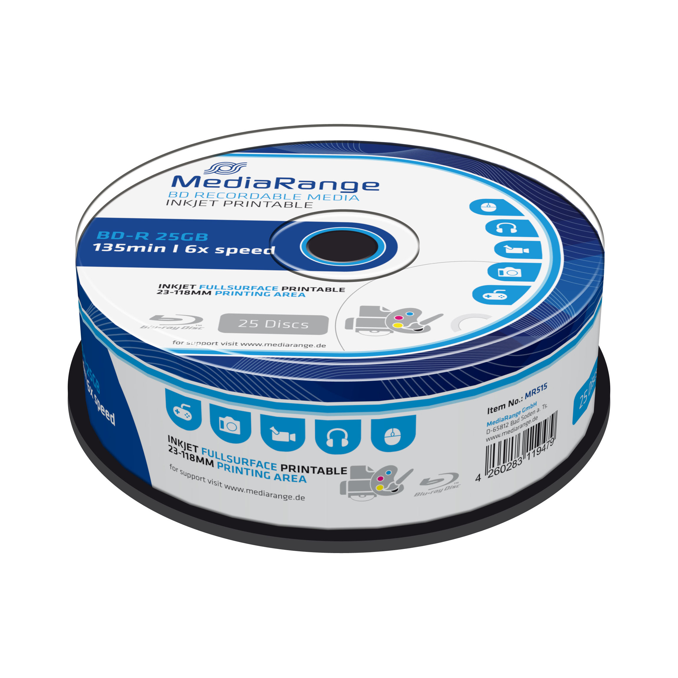 Kvalitní a cenově dostupná plně potisknutelná média BD-R značky MediaRange poskytují spolehlivý zápis dat s kapacitou až 25 GB při maximální rychlosti zápisu až 6x. Média jsou balena po 25 kusech ve spindlu.
