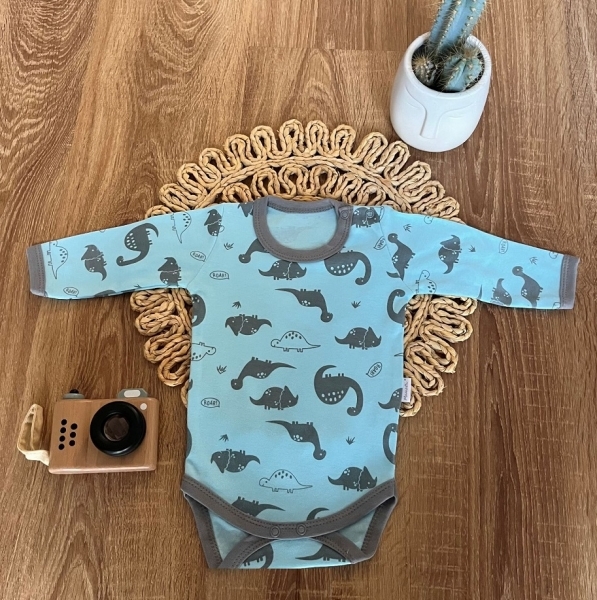 Kojenecké body, dl. rukáv Mamatti, zap. u krku, Dino park - modré s potiskem, vel. 74