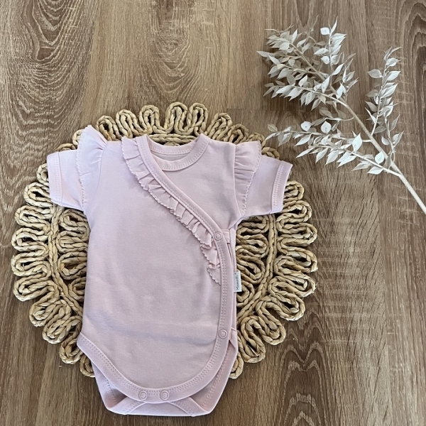 Kojenecké body, kr. rukáv Mamatti, zap. bokem, Puntík - pudrové s volánky