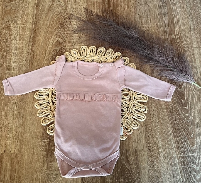 Kojenecké body, dl. rukáv Mamatti, zap. u krku, Puntík - pudrové s volánky, vel. 74; 74 (6-9m)