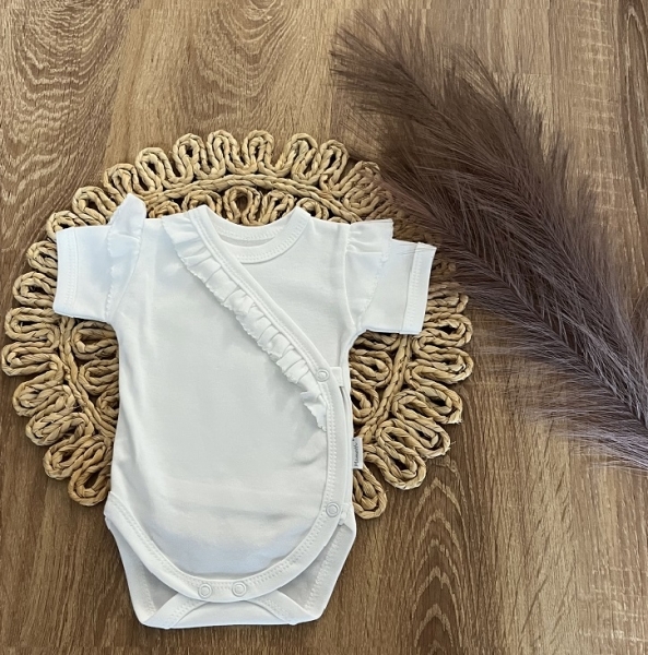 Kojenecké body, kr. rukáv Mamatti, zap. bokem, Puntík - bílé s volánky, vel. 62; 62 (2-3m)