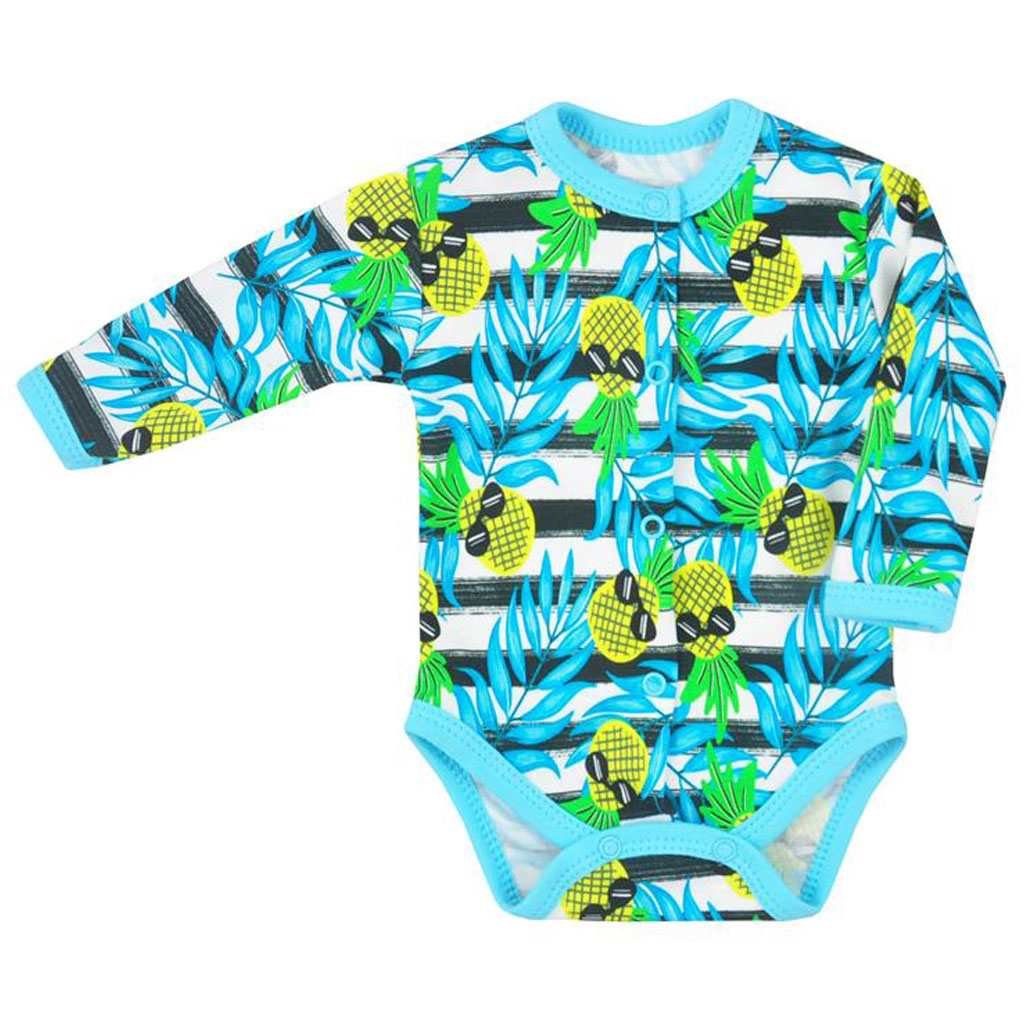 Kojenecké celorozepínací body Koala Tropical. Dětské body je zdobené s osvěžujícím tropical motivem. Zapínání na cvočky po celé délce a mezi nožičkami. Složení: 100% bavlna.