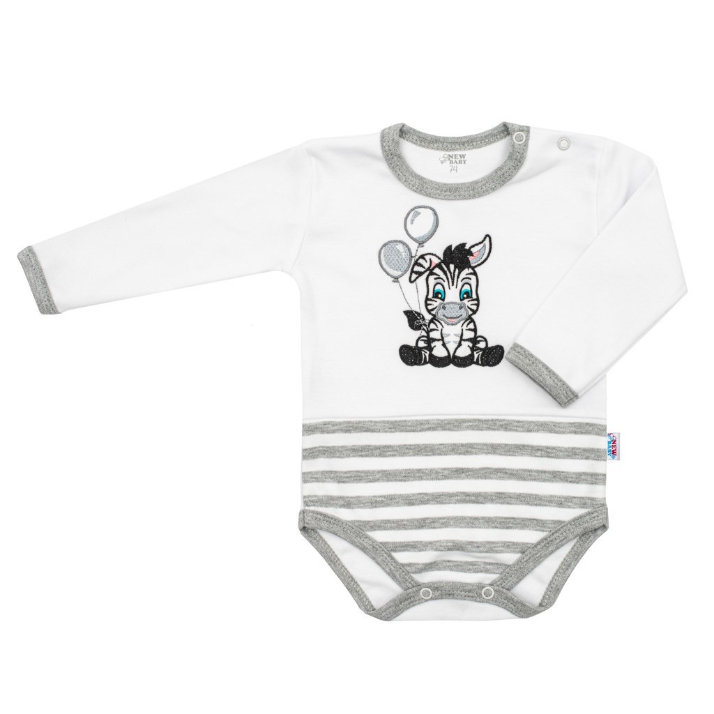 Bavlněné body české značky New Baby Zebra exclusive pro miminka. Body je zdobeno vyšitým obrázkem roztomilé zebry a spodní část je celopotištena pruhy. Obrázek je podlepený látkou. Okolo krčku, nožiček a ručiček má šedé lemování. Zapínání na ramínku a mezi nožičkami. Pro miminka je důležitým kouskem oblečení a při jakémkoliv pohybu jsou zádička miminka stále přikrytá. Složení: 100% bavlna.