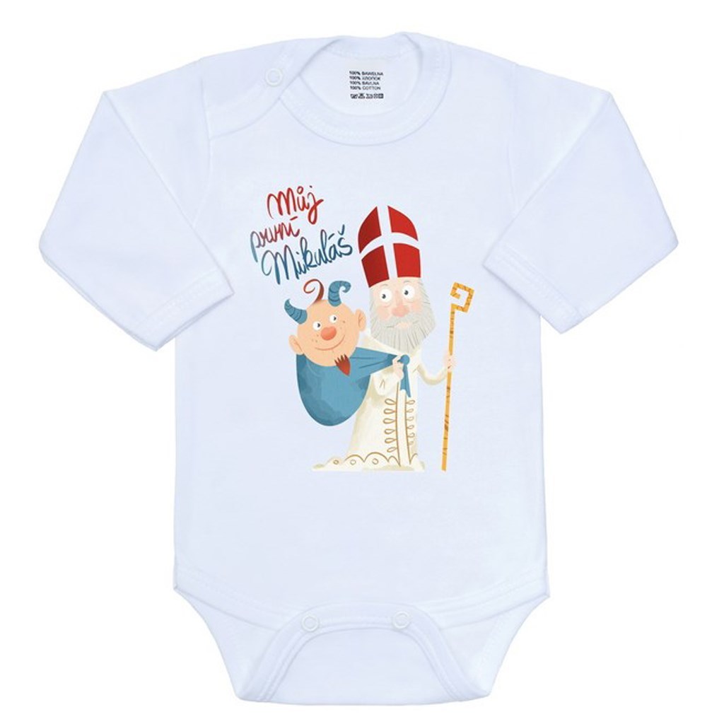 Originální bavlněné kojenecké body s dlouhým rukávem New Baby, s vtipným nápisem Můj první Mikuláš a obrázkem Mikuláše s čertem. Barvy použité k potisku jsou certifikované a vhodné pro miminka. Je vyrobeno z příjemného a kvalitního materiálu, ve kterém se bude Vaše miminko cítit příjemně. Body má zapínáni na cvočky na ramínku a mezi nožičkami, což usnadňuje oblékání a přebalování. Dopřejte Vašemu miminku vyniknout v originálním body. Složení: 100% bavlna. Rozměry: obvod kolem hrudníku cca 50 cm, délka rukávu cca 26 cm, celková délka cca 42 cm.