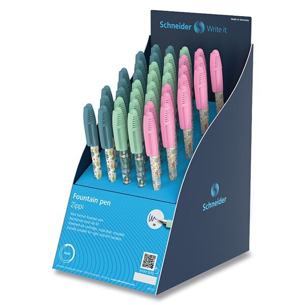 Bombičková pero Schneider Zippi v mini velikosti pro malé školáky v atraktivních motivech. Kvalitní ocelový hrot. Pevný plastový klip. Dodáváno s jednou bombičkou zmizíkovatelného inkoustu v modré barvě. Vhodné pro praváky i leváky. Ve stojánku mix 3 motivů. číst celé