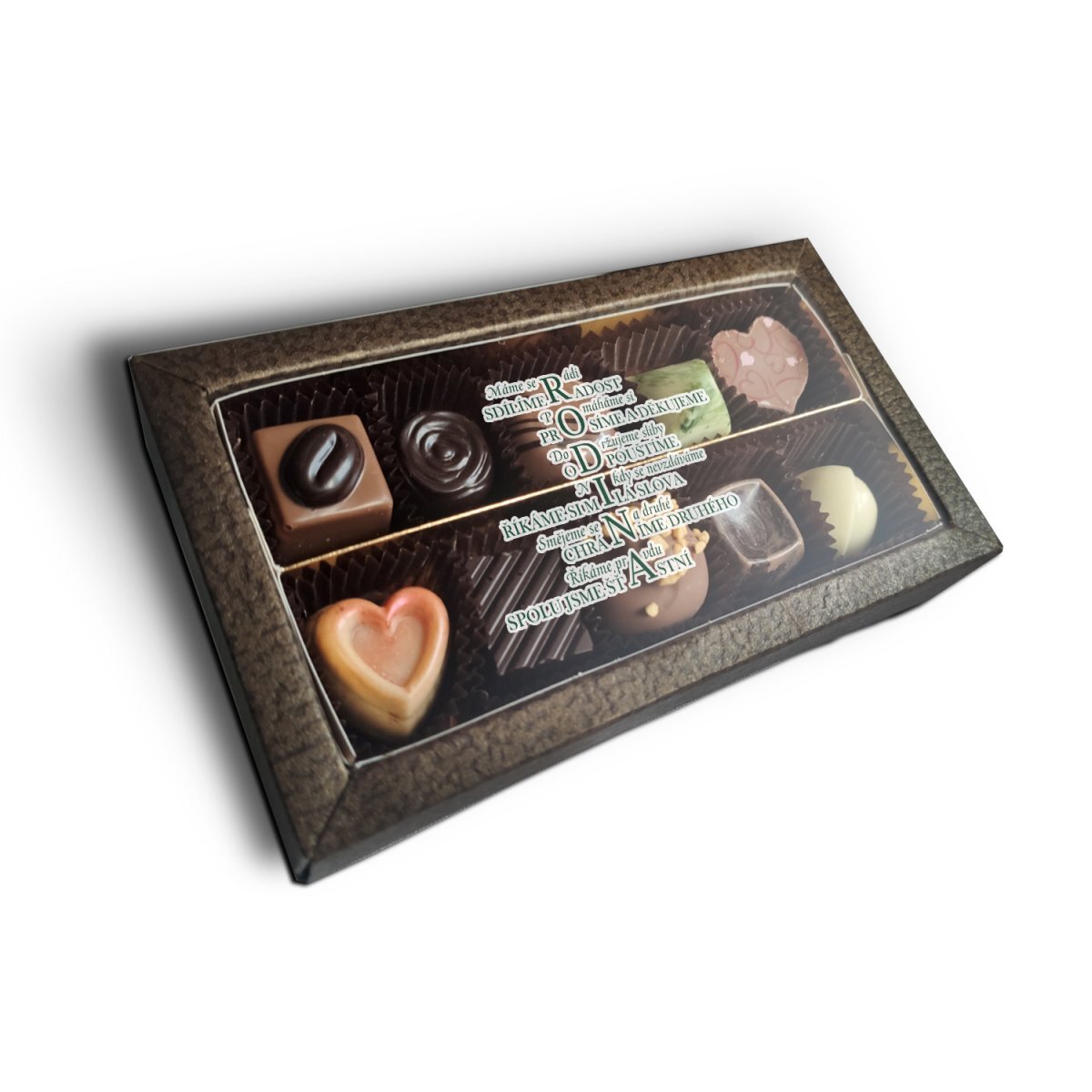 Krabička s pralinkami a lanýži s originálním motivem.Pralinky jsou ideálním dárkem pro milovníky luxusu a požitků. Tento zážitek z mlsání je navýšen o originální potisk, který vystihuje osobní věnování. Pralinky v balení jsou seskládané z mléčné, hořké a bílé čokolády s různými příchutěmi. Pralinky a jsou vyrobeny poctivou českou výrobou z té nejčistší čokolády bez lepku a palmového oleje. Darujte sladkou radost :-)3 varianty: 10, 20 a 28 kusů