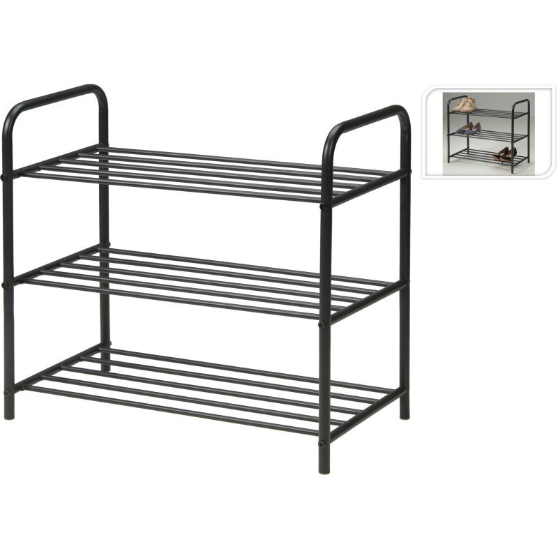 SHOE RACK IN MAT BLACK COLOR. 3 LAYERS. SIZE: 58X66X34CM. LEG TUBE: 19X0.8MM, TUBE: 10*0,8MM. POWDER COATED WITH ZINC MATERIAL. PACKED PER ONE IN BROWN CARTON WITH COLOR LABEL AND HANGTAG, 4 IN OUTER./ 360X80X680MM, Brown box/colour label / CFT 2,99,(3.132/40ft HQ)