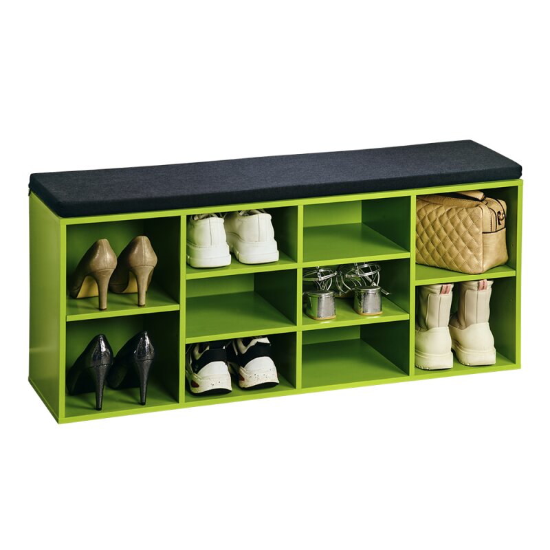 Praktický botník je vyroben z ekologicky zodpovědně získané dřevotřísky v zeleném provedení. Součástí botníku je polstrovaná lavice na sezení, která se dá nadzvednout.