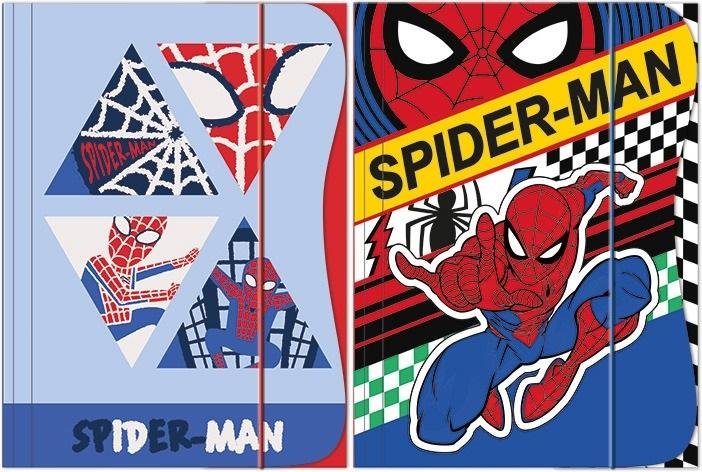Teczka formatu A4 wykonana z grubego papieru. Zadrukowana z zewnatrz oraz wewnątrz. Wyposażona w gumkę wzdłuż długiego boku. Posiada trzy wewnętrzne klapki zabezpieczające dokumenty przed wypadnięciem. Motyw SPIDER MAN.