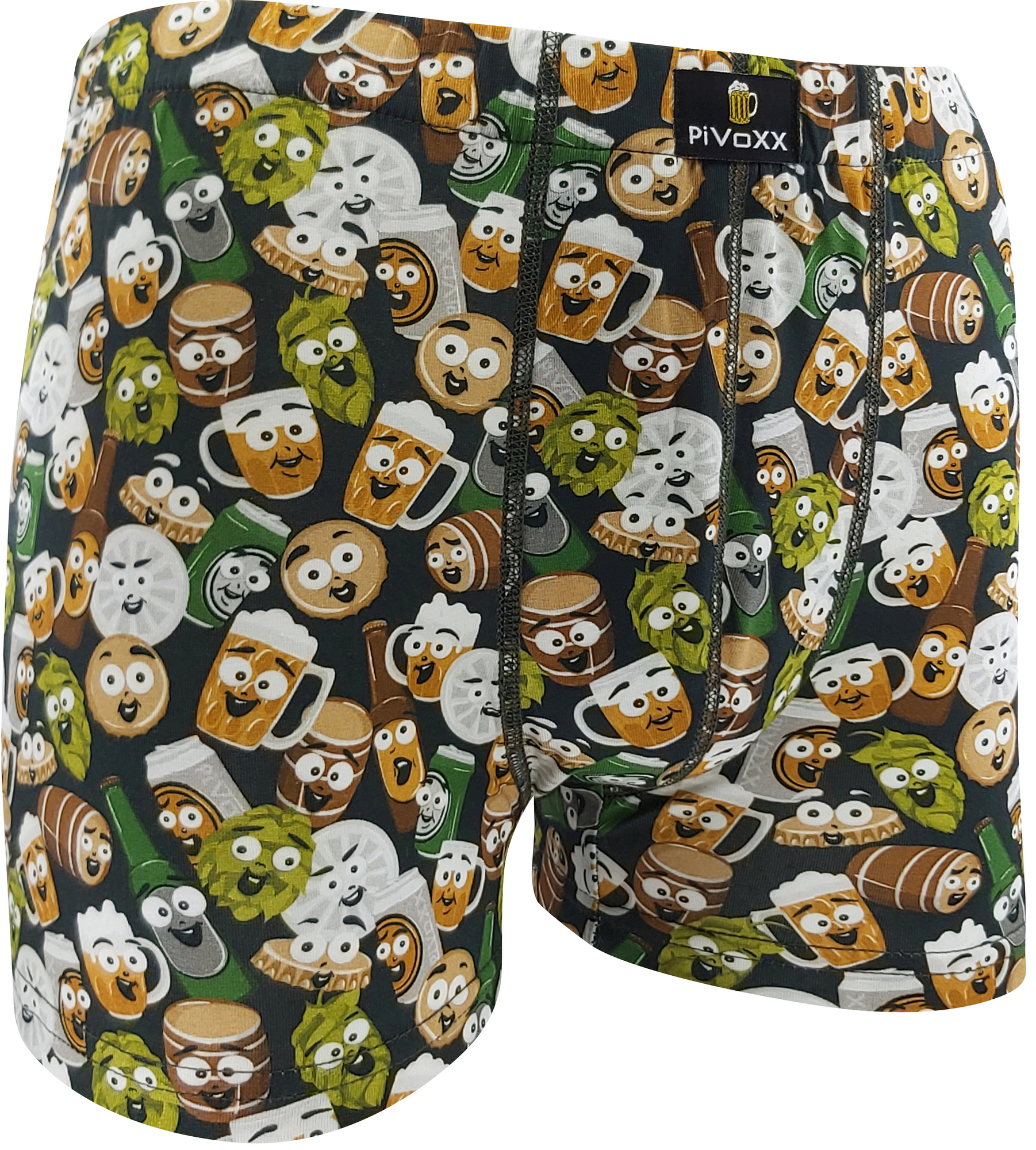 Pánské pivní boxerky VoXX® KEVIN PiVoXX jsou trendy elastické boxerky přiléhavého střihu pro každého muže. Přírodní bavlněný úplet je doplněný o pružný elastan, takže boxerky perfektně padnou. Zadní díl je vcelku a přední část je dvouvrstvá, díly jsou sešité plochými švy pro maximální pohodlí. Guma se nedotýká pokožky, je skrytá v úpletu. Pánské obrázkové boxerky mají celoplošný tisk s pivařskými motivy půllitrů a chmele na každodenní nošení pro každého správného milovníka piva.