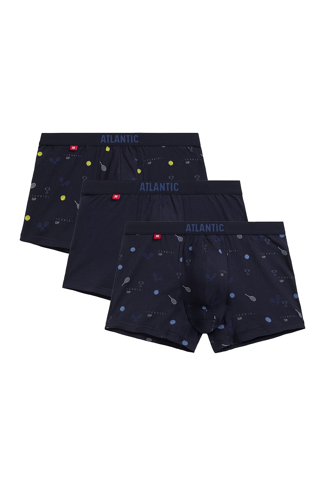Bokserki męskie- wysokiej jakości wzorzysta bawełna- sportowy charakter bielizny- w pasie szeroka guma z napisem ATLANTIC- idealne dopasowanie do ciała- pakowane w pudełko po trzy sztuki