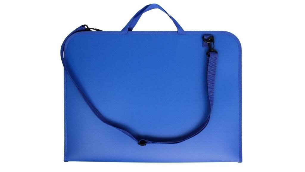 Teczka wykonana ze sztywnego tworzywa PP w kolorze niebieskim. Wymiary teczki 38x52 cm umożliwiają przechowywanie prac plastycznych w formacie A3 z zapasem miejsca. Wyposażona w zamknięcie na suwak oraz materiałowe rączki i odpinany pasek na ramię. Dodatkowa kieszeń wewnątrz ułatwia utrzymanie porządku. Grzbiet o szerokości 3 cm pozwala na przechowywanie w teczce przyborów plastycznych.