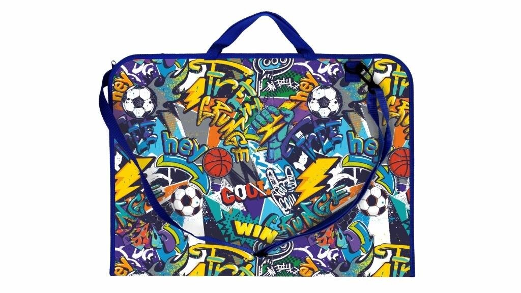 Teczka wykonana ze sztywnego tworzywa PP z ozdobnym nadrukiem oraz obszyciem w kontrastowym kolorze. Wymiary teczki 38x52 cm umożliwiają przechowywanie prac plastycznych w formacie A3 z zapasem miejsca. Wyposażona w zamknięcie na suwak oraz materiałowe rączki i odpinany pasek na ramię. Dodatkowa kieszeń wewnątrz ułatwia utrzymanie porządku. Grzbiet o szerokości 3 cm pozwala na przechowywanie w teczce przyborów plastycznych.