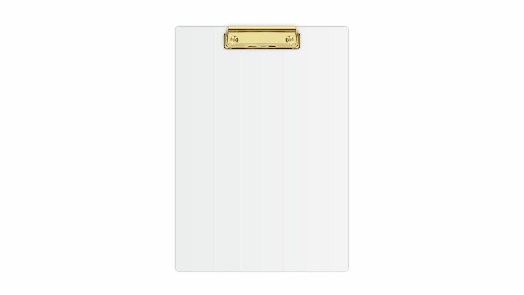 Tato podložka je vyrobena z bílého PVC s vnitřní výztuhou z kartonu, což zajišťuje pevnost a stabilitu při psaní i držení papírů. Praktický pružný zlatý mechanizmus pevně drží vaše dokumenty pohromadě, takže se můžete soustředit na svůj projev nebo práci bez obav, že by vám papíry sklouzly či se pomačkaly.