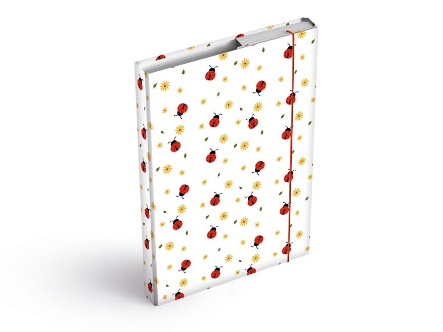 Školní desky v praktickém formátu A5 jsou vyrobeny z kvalitního lepenkového kartonu potaženého odolným laminem, který chrání vaše sešity před poškozením, oděrem a znečištěním. Díky pevné gumičce obsah deskách bezpečně drží, takže se sešity ani pracovní listy nepomačkají a neztratí se. Motív roztomilých berušek a květin oživí školní tašku každého žáka a přináší příjemný pocit hned po otevření.