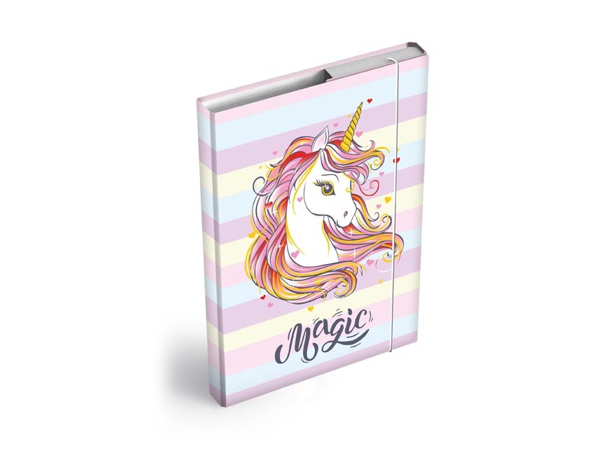 Školní desky na sešity ve velikosti A4 s motivem jednorožce. Nezbytná součást vybavení každého školáka. Díky školním deskám budou všechny sešity a učebnice pohromadě a neponičené. Tyto desky na sešity jsou opatřeny gumou, která zabraňuje samovolnému otevření. Heft box je vyroben z kvalitního lepenkového kartonu, potaženého laminem. Z tohoto důvodu se dá velice lehce udržovat.