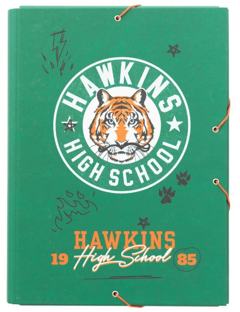 Zelená školní složka velikosti A4 vyvedená z motivu známé střední školy ve měste Hawkins ze seriálu Stranger Things. Vazba s 3 klopy a zapínáním na gumičky pro pevné uzavření složky. Vyrobeno z tvrdého kartonu potaženého matným laminovaným papírem. Tato složka je vhodná na jakékoliv vaše dokumenty a je nutností na pracovní či studentský stůl pro každého fanouška tohoto oblíbeného seriálu.