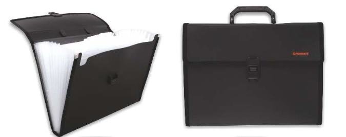 Wykonana z mocnego polipropylenu o grubości 0,6 mm, obszytego taśmą kaletniczą. Z rączką, zamykana nazamek. Zawiera 12 przegródek dostosowanych do dokumentów formatu A4 oraz przekładki indeksujące. Wymiary: 330 x 240 x 35 mm. Pakowana pojedynczo w woreczek foliowy.