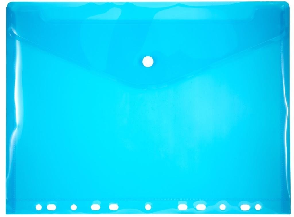 Koperta wykonana z kolorowego, transparentnego polipropylenu o grubości 0.18 mm. Zapinana na zatrzask. Europrofaracja umożliwia wpięcie teczki do segregatora, orientacja pozioma, wymiary 31,2x23,5 cm.