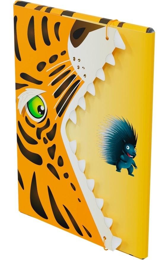 Tygrys jest bardzo silnym zwierzęciem, jest drapieżnikiem. Mogłoby się wydawać, że ten malutki jeżozwierz wcale nie ma z nim szans. Ale czy na pewno? To, że ktoś jest wielki nie oznacza, że wszystko może, że niczego się nie boi, że sprosta każdemu zadaniu. A gdyby tak spojrzeć trochę bardziej metaforycznie na teczkę. Ja to ten mały jeżozwierz, tygrys to wyzwanie, czyli coś co muszę zrobić, ale strasznie mnie to przeraża. Zupełnie nie wiem jak mam się zabrać do tego tematu. Bo co ja mogę? Jestem tylko małym, nic nie potrafiącym jeżozwierzem! A teraz spójrzmy na to inaczej. Tygrys, ten wielki zły zwierzak ma szeroko otwarta paszczę z tymi ogromnymi wielkimi zębami, a jeżozwierz jest taki uśmiechnięty jakby właśnie wygrał na loterii! Czysta abstrakcja? A może jednak coś w tym jest? Są takie chwile w życiu, gdy myślimy że już nie damy rady, że nie możemy niczego osiągnąć, że do niczego się nie nadajemy. Każdy może mieć chwilę słabości. To zupełnie naturalne. Ale życie to nie bajka, to ciągłe wyzwania. To jak je przeżyjemy zależy od nas, od naszego nastawienia. Może zamiast mówić: to się nie uda, lepiej pomyśleć: dam radę, a przynajmniej spróbuję!. Oczywiście nie jest to łatwe zadanie, ale jeżeli coś jest trudne do osiągnięcia, to później kiedy się już z tym uporamy, nasza satysfakcja jest o wiele większa! Zamiast od razu dawać za wygraną, warto jest przynajmniej spróbować uporać się z danym zadaniem czy problemem. Niech ten uśmiechnięty jeżozwierz będzie motywacją do działania! Niech ta teczka pomoże uporządkować ważne dokumenty. Niech ten tygrys ucieka w siną dal i zabierze ze sobą zmartwienia. Jedna teczka, niby tylko teczka, a jednak tak bardzo może dać do myślenia i być może zachęcić do działania! Powodzenia!