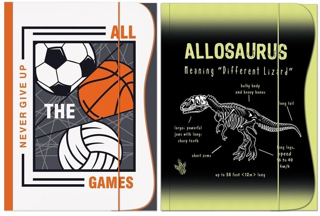 Teczka formatu A4 wykonana z grubego papieru. Zadrukowana z zewnatrz oraz wewnątrz. Wyposażona w gumkę wzdłuż długiego boku. Posiada trzy wewnętrzne klapki zabezpieczające dokumenty przed wypadnięciem. Przednia część teczki wycięta w fantazyjny kształt. Motyw dla chłopca