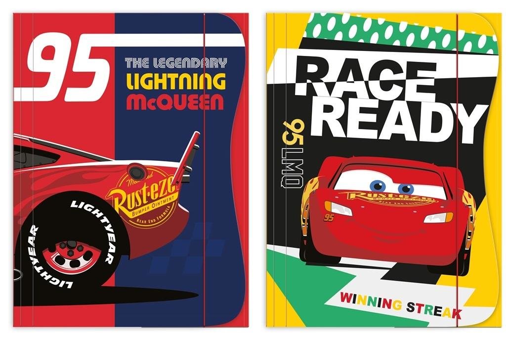 Teczka formatu A4 wykonana z grubego papieru. Zadrukowana z zewnatrz oraz wewnątrz. Wyposażona w gumkę wzdłuż długiego boku. Posiada trzy wewnętrzne klapki zabezpieczające dokumenty przed wypadnięciem. Przednia część teczki wycięta w fantazyjny kształt. Motyw z serii Cars. Dostępna w 2 wzorach.