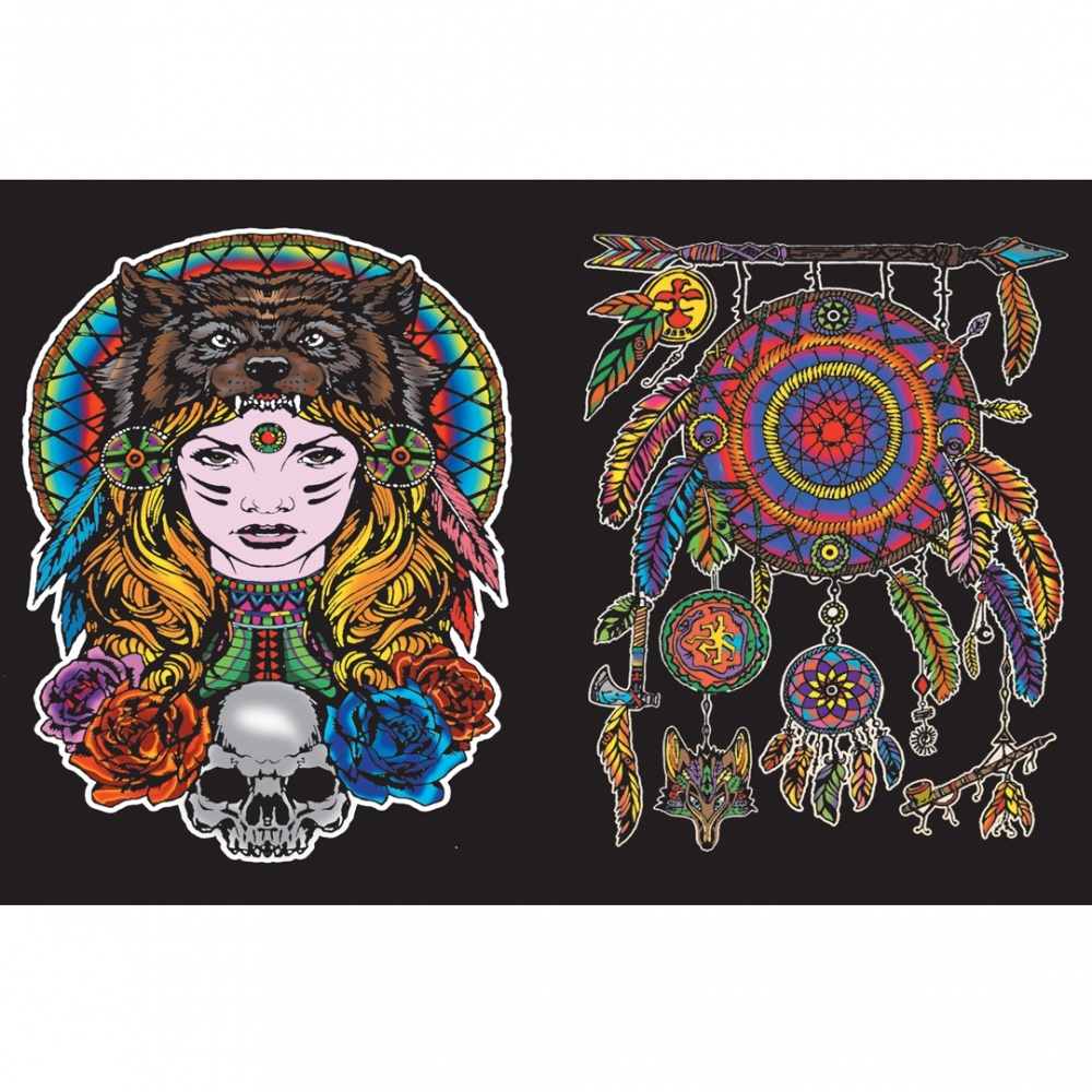 Sametové desky se dvěma obrázky k vybarvení na přední a zadní straně, motiv Lapač snů. Vybarvovací šablona je ze sametu, který usnadňuje vybarvení. Obrázek můžete vybarvit fixami, pastelkami nebo voskovkami. Okraje motivu jsou přesně vymezeny sametem a zabraňují přetahování okrajů. Přední strana desek je zobrazena vpravo.Obrázek je možné vybarvit dle přiloženého motivu nebo můžete popustit uzdu své fantazii.Desky na papír vel.: A4Vhodné pro děti od 3 let.