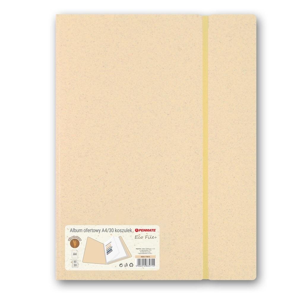 pszenicznej. Kreatywny, nowy materiał ma właściwości i zalety podobne do tradycyjnych tworzyw sztucznych. Okładka o grubości 0,6 mm. Wewnątrz albumu wysoko przezroczyste koszulki o grubości 0,05 mm. Gumka w kolorze teczki zabezpiecza przed wypadnięciem dokumentów. Wymiary: 240x315x15 mm.