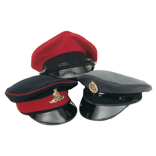 Čepice britské armády s různými odznaky. číst celé